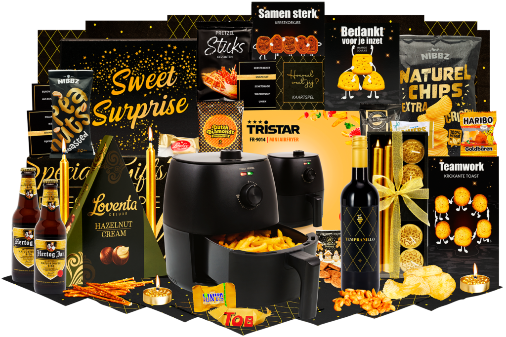 Airfryer 2 liter 1150 Watt • Geschenkdoos met strik • Dinerkaarsen 0 cm, 2 stuks • Waxines 4 stuks • Kaartspel Weet jij het • Servetten 8 stuks • Rode wijn Tempranillo 75cl • Hertog Jan Bier 33cl 2 stuks • Hartige zoutjes peper-zeezout 60 gr •Krokante toast 75 gr • Pretzels 40 gr • Pinda’s gezouten 50 gr •Ribbelchips gezouten 90 gr • Hazelnoot pralines 110 gr • Stroopwafel 64 gr 2 stuks • Kerstkoekjes 80 gr • Sweet surprise box
