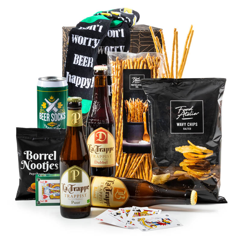 Dit is hèt ultieme pakket voor de liefhebber van bier, borrel en gezelligheid! Met een knipoog: grappige biersokken verpakt in een ludiek bier/spaarpot blik. Comfortabel én origineel. Daarbij diverse krokante klassiekers die perfect matchen met een koud biertje. Met onder meer en La Trappe blond bier, 33 cl, een La Trappe Puur bio bier, 33 cl en een La Trappe dubbel bier, 33 cl.