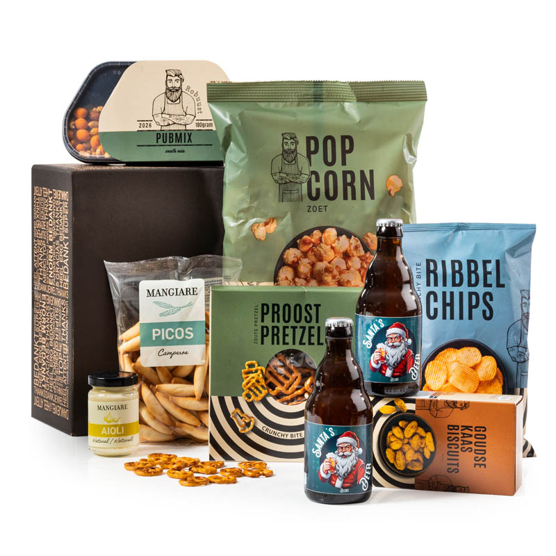 Twee flesjes “Santa” bier Blond, à 33 cl • Ribbelchips paprika, 90 gram • Pubmix zoutjes, 180 gram • Goudse kaas baguettes, 75 gram • Pretzels, 100 gram • Mangiare picos, 150 gram • Mangiare aioli, 130 gram • Popcorn zoet, 120 gram