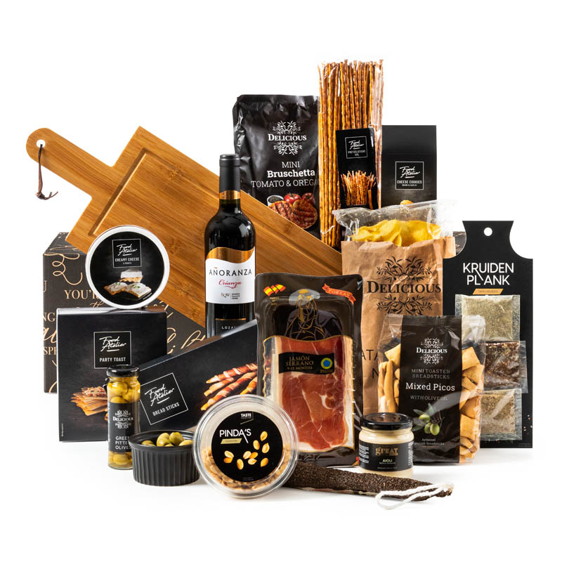 Zin in Tapas 2.0? Dan is dit hèt kerstpakket voor jou. Het bevat een luxe tapasplank van 58 cm lang en 19 cm breed, voldoende plaats om al de bijgevoegde Spaans relateerde tapas op te kunnen presenteren. De Spaanse wijn mag natuurlijk niet ontbreken. Alles op de plank en genieten maar. Dat is nog eens een binnenkomer!