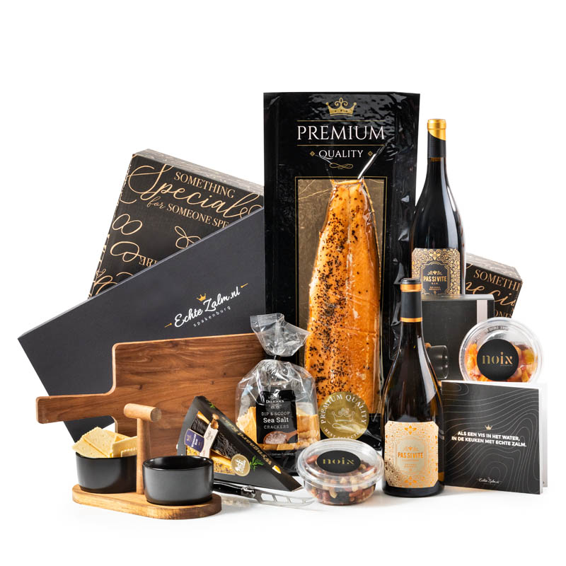 Een bijzonder verfijnd en culinair kerstpakket voor de echte fijnproever. Deze royale kerstbox bevat een rijke combinatie van Franse topwijnen, wit en rood. Daarbij smaakt de warm gerookte en vacuümverpakte zalmzijde van ca. 850 gram voortreffelijk! In de zalm giftbox ook nog een receptenboekje met verrassende en lekkere zalm recepten. Met stijlvolle serveeraccessoires zoals een houten serveerplank, keramieken schaaltjes en een luxe kaasmes van Laguiole is dit relatiepakket klaar om er direct van te gaan genieten. Wie ga jij hiermee verrassen? Succes gegarandeerd!